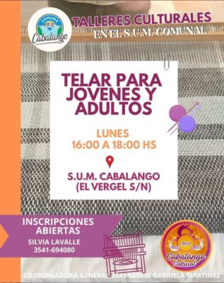 La Comuna de Cabalango informa que se encuentran abiertas las inscripciones para el Taller de Telar destinado a jóvenes y adultos.